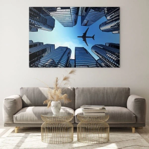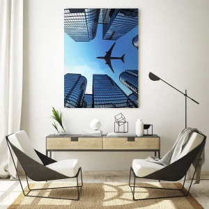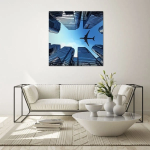 Glasbilledet, der måler 70x50 cm i vandret format, er lavet af materialer af højeste kvalitet, der fremhæver detaljer og farvernes intensitet. Takket være moderne glastrykteknologi er hvert element - fra refleksioner på bygningsfacader til silhuetten af et fly - blevet gengivet med ekstraordinær præcision, hvilket giver billedet dybde og en realistisk karakter.