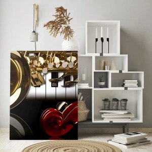 Billede på glas - Saxofon, keyboard og bue i en kunstnerisk komposition - 70x50cm - Metalplader, træ og elfenben - Moderne vægdekoration til stue og soveværelse ARTTOR
