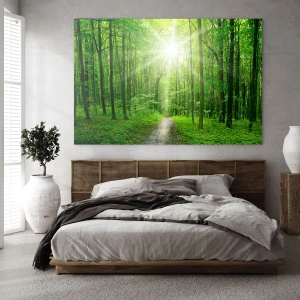 Billede på glas - En sti i skoven oplyst af solens stråler - 70x50cm - Grøn katedral - Moderne vægdekoration til stue og soveværelse ARTTOR