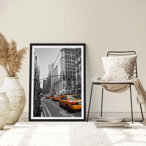 • Plakaten forestiller travle gader omkranset af gule taxaer mod en baggrund af monokromatisk arkitektur. Det er den perfekte dekoration for elskere af urban stil og dynamiske interiører.