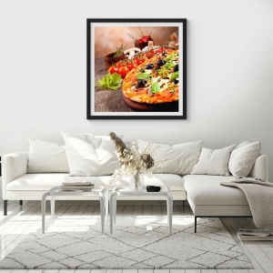 Plakat i sort ramme - Pizza med oliven og krydderurter med friske ingredienser - 50x70cm - Af tellurholdige bestanddele - Moderne vægdekoration til stue og soveværelse ARTTOR
