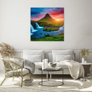 Dette 70x50 cm glaskunsttryk med titlen Island - Ild og Vand er et unikt motiv, der skildrer det islandske landskab. Maleriet forestiller et majestætisk bjerg, vulkansk terræn, et vandfald og frodig vegetation. Den nedgående sol oplyser hele landskabet og giver det intense, varme farver. "Vand"-motivet i form af et vandfald står i kontrast til vulkanens "ild" og naturens energi og skaber en dynamisk og levende komposition.