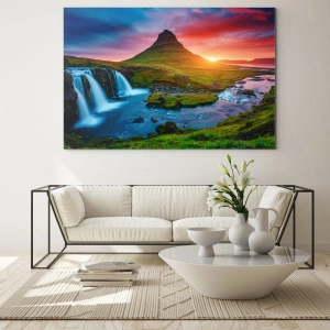 Dekorationen Island - Ild og Vand er et fremragende valg for dem, der ønsker at introducere vild, fantastisk natur og unikke landskaber i deres interiør. Maleriet er perfekt til interiører i en moderne, økologisk eller naturinspireret stil. Motivet med bjerge, vandfald og vulkan fremkalder en følelse af eventyr og forbindelse med elementerne.