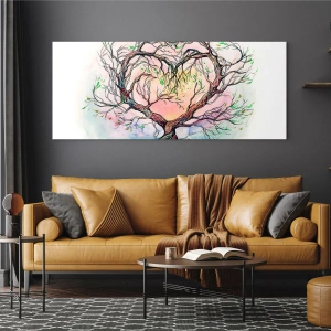 Billede på glas - Et hjerteformet træ med en farverig pastelbaggrund - 70x50cm - Sammen mod stormene - Moderne vægdekoration til stue og soveværelse ARTTOR