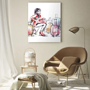 Maleriets skabere hentede inspiration fra rejser og mode, hvilket er tydeligt synligt i kombinationen af den kvindelige silhuet og kuffertmotivet. Den røde frakke og de farverige detaljer på kufferterne tilføjer energi og optimisme til helheden og understreger værkets moderne karakter. Denne harmoniske kombination af kunst og hverdagstemaer vil helt sikkert appellere til stilelskere og kreative dekorationer.