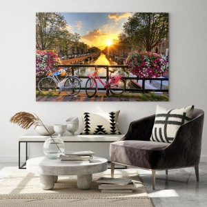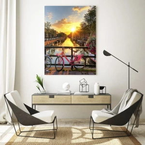 - En solnedgang over en Amsterdam-kanal med cykler og smukke blomster i baggrunden. En perfekt dekoration til interiør inspireret af byen, naturen og roen.