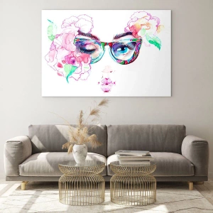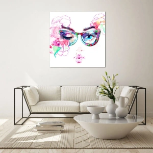 Billede på glas - Kvinders øjne med blomster og farverige briller i akvarelstil - 70x50cm - Et fristende løfte - Moderne vægdekoration til stue og soveværelse ARTTOR