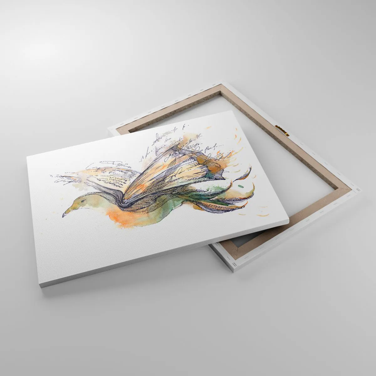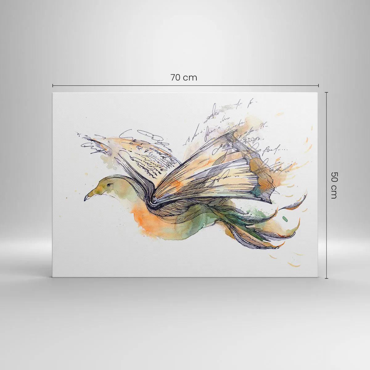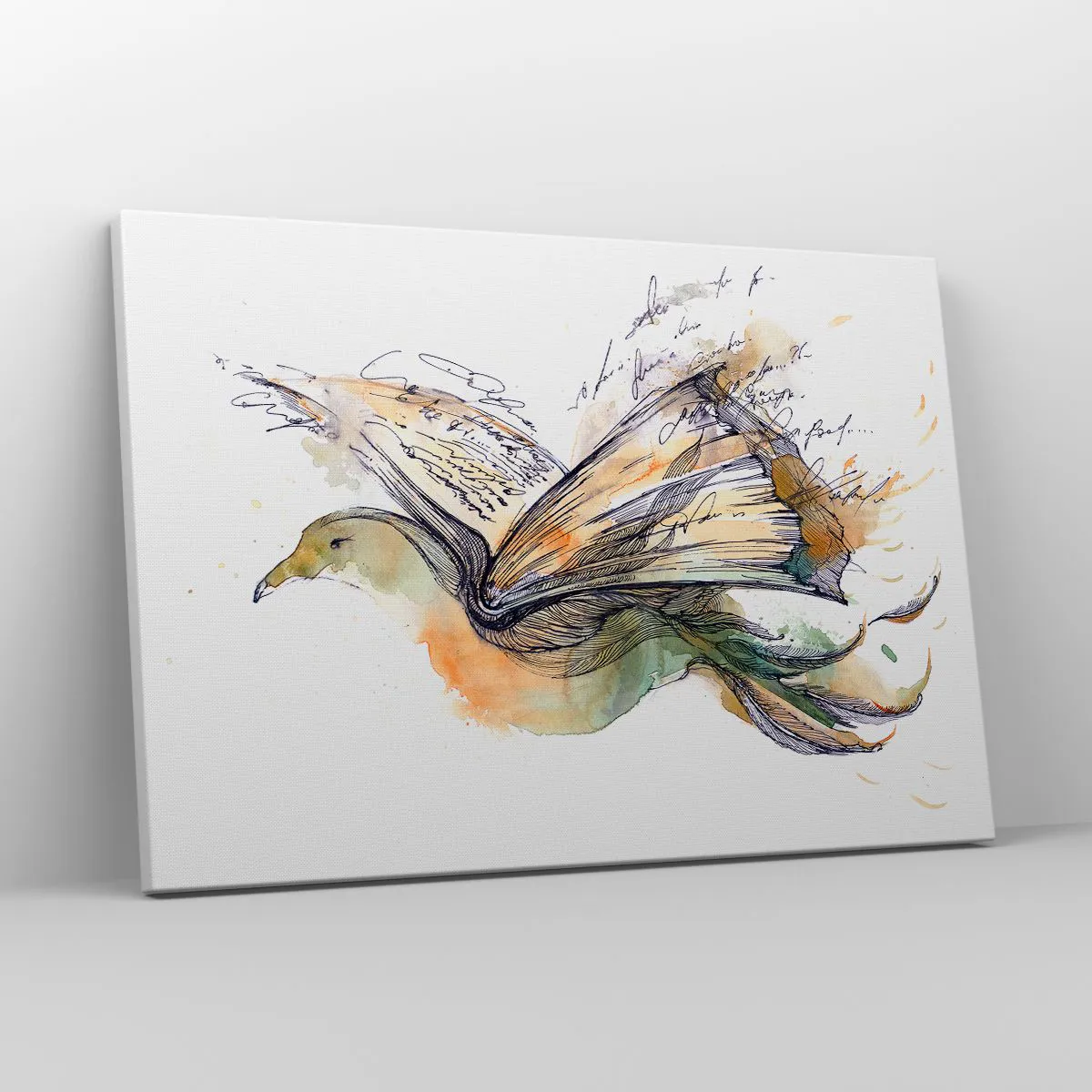 Lærredstryk - Billede på lærred - Kunstnerisk akvarelmaleri af en fugl med en bog som vinger - 70x50cm - På poesiens vinger - Moderne vægdekoration til stue og soveværelse ARTTOR