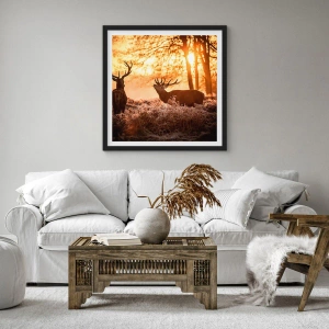 Plakat i sort ramme - Hjorte i den opgående sols stråler mod skovens baggrund - 50x70cm - En jægerdrøm - Moderne vægdekoration til stue og soveværelse ARTTOR