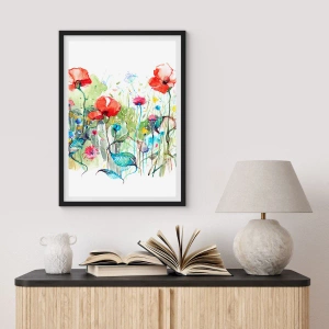 - Denne akvarelplakat forestiller en malerisk eng med valmuer og vilde blomster. Det er det perfekte valg for dem, der værdsætter naturens subtilitet og skønhed.