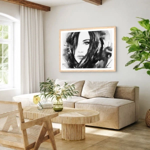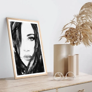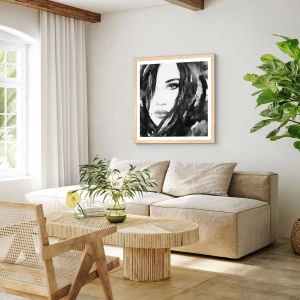 Plakat i ramme af lyst egetræ - Portræt af en dame i sort og hvidt - 30x30 cm