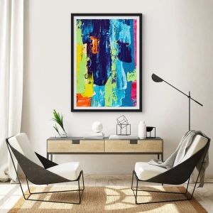 - Denne plakat har abstrakte penselstrøg i livlige farver som blå, gul og rød. Den er perfekt til moderne interiører og tilføjer energi og definition. Den leveres med en elegant sort ramme.