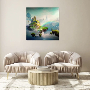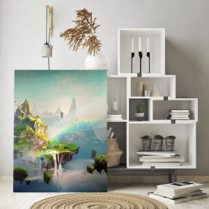 Kompositionens centrale punkt er en majestætisk ø med maleriske bygninger og frodigt grønt. Vandfald, der flyder fra dens kanter, tilføjer dynamik og en følelse af bevægelse, mens de omgivende skyer og en blid regnbue giver lethed og en magisk karakter til helheden. I baggrunden strækker øer og bjerge sig ud i horisonten og skaber et uforglemmeligt landskab.