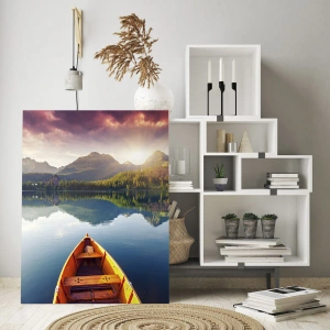 Billede på glas - Tre træbåde på en sø med udsigt over bjergene ved solnedgang - 70x50cm - Intet imod naturen - Moderne vægdekoration til stue og soveværelse ARTTOR