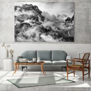 - Et glasmaleri, der forestiller monumentale bjerge i sort-hvid med tåge, der hænger i dalene. En perfekt dekoration til at bringe fred og harmoni.