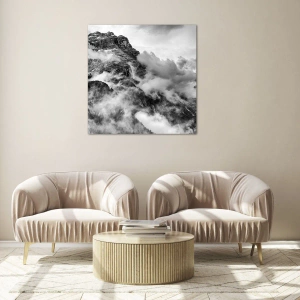 "Sorte og hvide bjerge" er et unikt glasbillede, der måler 70x50 cm, og som forestiller majestætiske bjerge indhyllet i tåge i en sort-hvid æstetik. Delikate gråtoner og subtile kontraster giver denne komposition dybde og udtryksfuldhed og skaber en unik atmosfære af fred og monumentalitet.