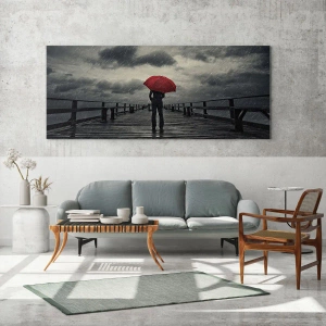Maleriets visuelle komposition består af molens rummelige, næsten tomme rum, hvilket forstærker følelsen af ensomhed. Den røde paraply i mandens hænder tilføjer farve til denne monokromatiske setting, hvilket gør maleriet mere udtryksfuldt og fuldt af kontraster. Dette maleri er perfekt til minimalistiske og moderne interiører, men det passer også ind i mere klassiske rum.