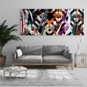 Billede på glas - En abstrakt komposition med geometriske mønstre og intense farver. - 70x50cm - Kvadratisk - Moderne vægdekoration til stue og soveværelse ARTTOR