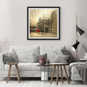 Plakat i sort ramme - En figur i en rød frakke mod baggrunden af en vinterby - 50x70cm - En date i London-tågen - Moderne vægdekoration til stue og soveværelse ARTTOR