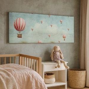 "Fri fra livets travlhed" er et unikt lærredstryk på 70x50 cm, der forestiller svævende balloner i retrostil mod en blå himmel og grøn baggrund. Pastelfarver og subtile detaljer bringer nostalgi og harmoni til kompositionen. Ballonmotivet symboliserer lethed og frihed, og helheden skaber et fredeligt og inspirerende landskab.
