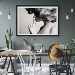 - Denne plakat forestiller et portræt af en kvinde, der laver en gestus af stilhed, gengivet i elegant sort-hvid. Perfekt til minimalistiske og moderne interiører. Produktet leveres med en sort ramme på 50x70 cm.