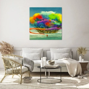 Billede på glas - En farverig eksplosion af røg mod baggrunden af et ensomt træ. - 70x50cm - Giv liv til denne verden - Moderne vægdekoration til stue og soveværelse ARTTOR