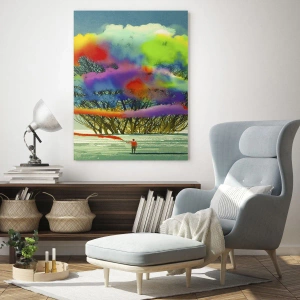 - Dette glastryk på 70x50 cm forestiller en farverig eksplosion af røg, der omgiver et enkelt træ mod en blå himmel. Perfekt til interiører, der søger udtryksfulde accenter og inspiration.