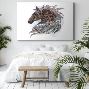 Lærredstryk - Billede på lærred - En geometrisk hest med en farverig, detaljeret manke - 70x50cm - Den keltiske krigers hest - Moderne vægdekoration til stue og soveværelse ARTTOR