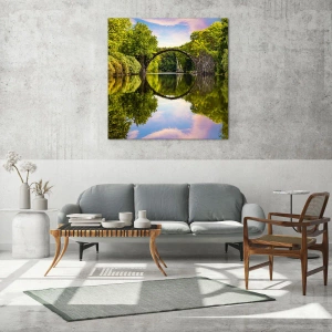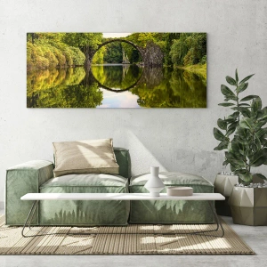 Billede på glas - En stenbro spejlet i søens rolige overflade - 70x50cm - På mødet mellem to verdener - Moderne vægdekoration til stue og soveværelse ARTTOR