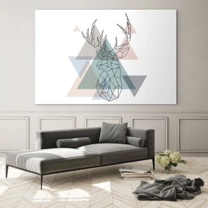Billede på glas - Geometrisk tegning af en hjort mod en baggrund af pastelfarvede trekanter - 70x50cm - I en geometrisk skov - Moderne vægdekoration til stue og soveværelse ARTTOR