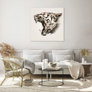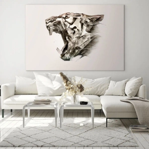 Billede på glas - Geometrisk illustration af en brølende tiger på en lys baggrund - 70x50cm - Du ved allerede, hvem der har ansvaret - Moderne vægdekoration til stue og soveværelse ARTTOR