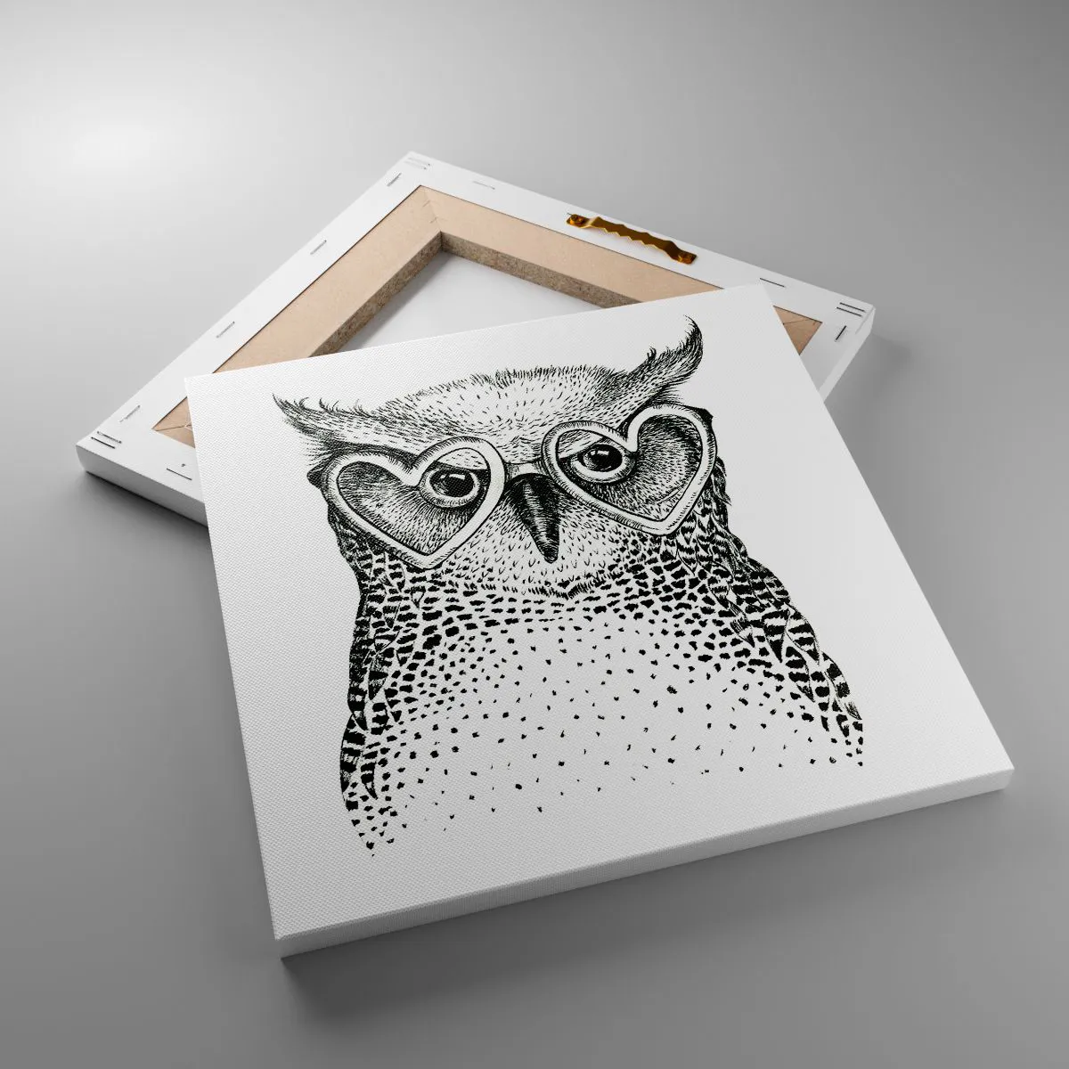 Lærredet er spændt op over rammen. Siderne og kanterne trykkes for at danne en fortsættelse af billedet. Maleriet er klar til at blive hængt op på væggen. Hvert produkt har en bøjle, der er fastgjort til rammen, og et samlesæt (skrue + dyvel).