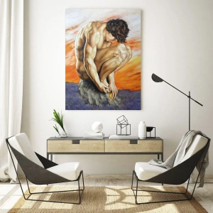 Vægmaleriet "Fordybet i sig selv" er et unikt værk, der kombinerer menneskekroppens styrke med naturens intensitet. Kompositionens centrale element er en nøgen menneskekrop, vist i en naturlig positur, der står i kontrast til den dynamiske baggrund i nuancer af orange himmel. Denne kombination skaber ikke kun visuel spænding, men opfordrer også til refleksion over den menneskelige naturs skønhed og skrøbelighed.