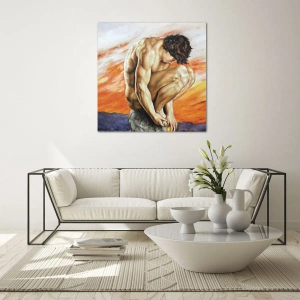 Billede på glas - En nøgen menneskekrop mod en intens orange himmel. - 70x50cm - Sænket i sig selv - Moderne vægdekoration til stue og soveværelse ARTTOR