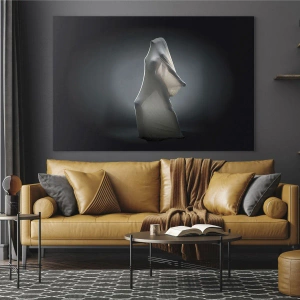 Den klare kontrast mellem den mørke baggrund og det bløde lys fremhæver silhuettens kunstneriske form og subtile detaljer. Dette værk inspirerer til refleksion og skaber en ekstremt rolig, men fascinerende atmosfære i interiøret.