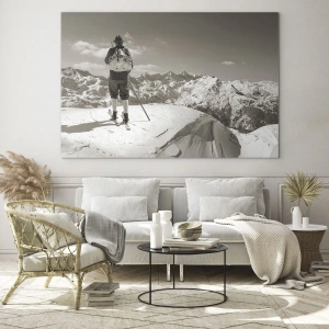 Billede på glas - Skiløber på en bjergtop i sort-hvid - 70x50cm - Og bjergene er de samme - Moderne vægdekoration til stue og soveværelse ARTTOR
