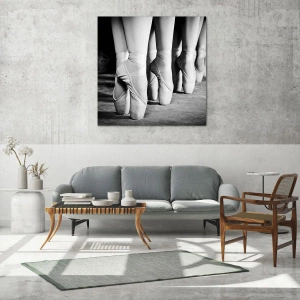 Ballerinaernes pointesko, der er afbildet i detaljer mod den minimalistiske baggrund, er et symbol på skønhed, elegance og udholdenhed. Den sort-hvide æstetik får maleriet til at udstråle fred og klassisk stil og passer perfekt til moderne og klassiske indretningsdesigns.