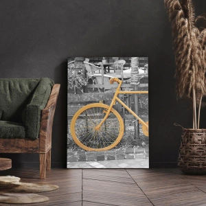 Lærredstryk - Billede på lærred - Kunstnerisk fotografi af en gul cykel mod en sort-hvid baggrund - 70x50cm - Gå, jeg venter her - Moderne vægdekoration til stue og soveværelse ARTTOR