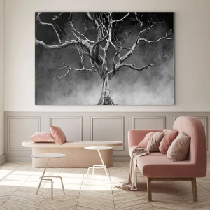 Træet, afbildet i diskrete nuancer af sort og hvid, symboliserer natur og forgængelighed. Tågen i baggrunden tilføjer et strejf af mystik til kompositionen og skaber en unik atmosfære i det rum, hvor dette maleri skal vises.