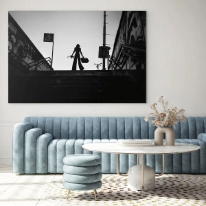 Billede på glas - Sort-hvid silhuet af en kvinde mod en bylandskabs baggrund - 70x50cm - Vandring i byen - Moderne vægdekoration til stue og soveværelse ARTTOR