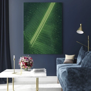 - Glasprintet forestiller et nærbillede af et grønt blad dækket af vanddråber. Det naturlige og tropiske motiv bringer friskhed og ro til ethvert interiør og er perfekt til moderne rum.