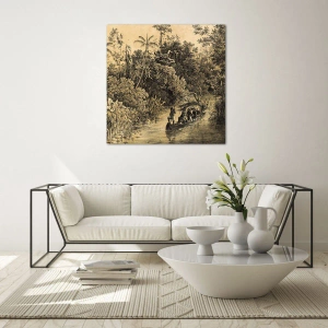 "Ekspedition til kilden" er et ekstremt atmosfærisk glasmaleri på 70x50 cm, der forestiller en bådrejse gennem en tæt, tropisk jungle. Stiliseret til at ligne en gammel gravering, indfanger trykket den ekstraordinære atmosfære af at opdage det ukendte og fremkalder ånden fra gamle ekspeditioner. Den sepia-tonede farvepalet giver kompositionen en nostalgisk og klassisk karakter.