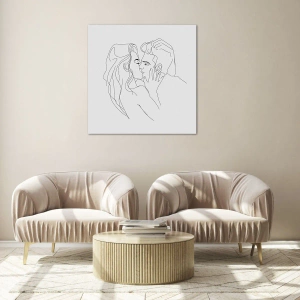 Billede på glas - En minimalistisk tegning af et par i et romantisk kys - 70x50cm - I samme linje - Moderne vægdekoration til stue og soveværelse ARTTOR