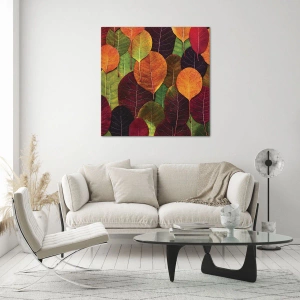 - En kunstnerisk komposition af farverige blade i efterårsfarver. Kombinationen af rød, orange, grøn og brun skaber en harmonisk mosaik, der bringer fred, varme og en unik atmosfære inspireret af naturen til interiøret.