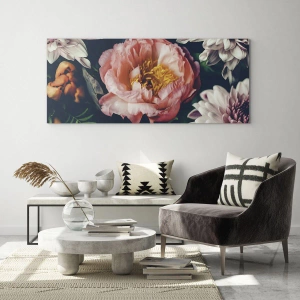 - En romantisk komposition af pæoner og krysantemum i pastelfarver mod en mørk baggrund. Dette ARTTOR-glastryk i et 70x50 cm landskabsformat er perfekt til feminine eller elegante interiører.