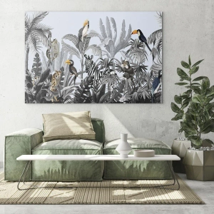 "Eksotiske dyr i en sort-hvid jungle på en lys baggrund" er et ekstraordinært maleri, der kombinerer den sort-hvide stil af tropisk vegetation med farverige accenter af eksotiske dyr. I forgrunden kan man se papegøjer, tukaner, en leopard, en zebra og aber, der bringer liv og farve til den neutrale baggrund. Blade fra palmer og tropiske planter er vist i grå nuancer, hvilket gør de farverige elementer iøjnefaldende og bliver fokuspunktet...