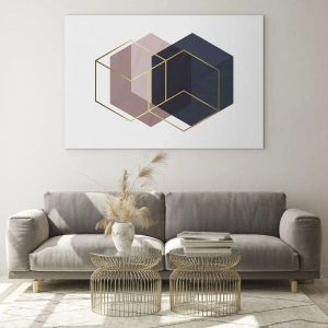 Billede på glas - Gyldne konturer af terninger mod en baggrund af marineblå og lyserøde ensfarvede stoffer - 70x50cm - Styrken ved enkelhed - Moderne vægdekoration til stue og soveværelse ARTTOR