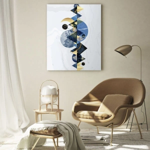 - En komposition af abstrakte geometriske former i nuancer af marineblå, guld og sort. Maleriet skiller sig ud med sin moderne stil og interessante farvekontrast. Et fremragende valg til elegante, minimalistiske interiører.