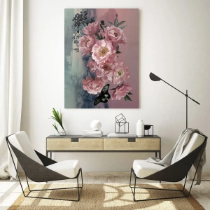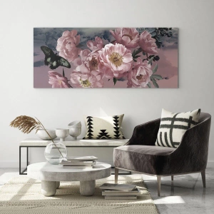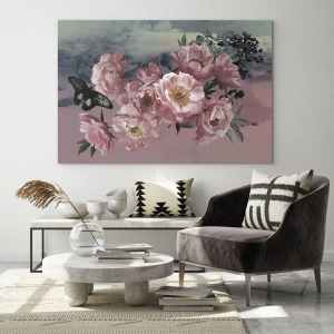 - En romantisk komposition af lyserøde pæoner og en sort sommerfugl mod en sløret, pastelfarvet himmel. Blomstermotivet udstråler subtilitet og lethed, perfekt til interiører med en feminin og rolig karakter.