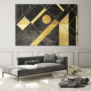 - Maleriet har en elegant komposition af geometriske former i nuancer af guld, sat op mod en dybsort baggrund. Glamour og art deco forenes i en harmonisk visuel form.